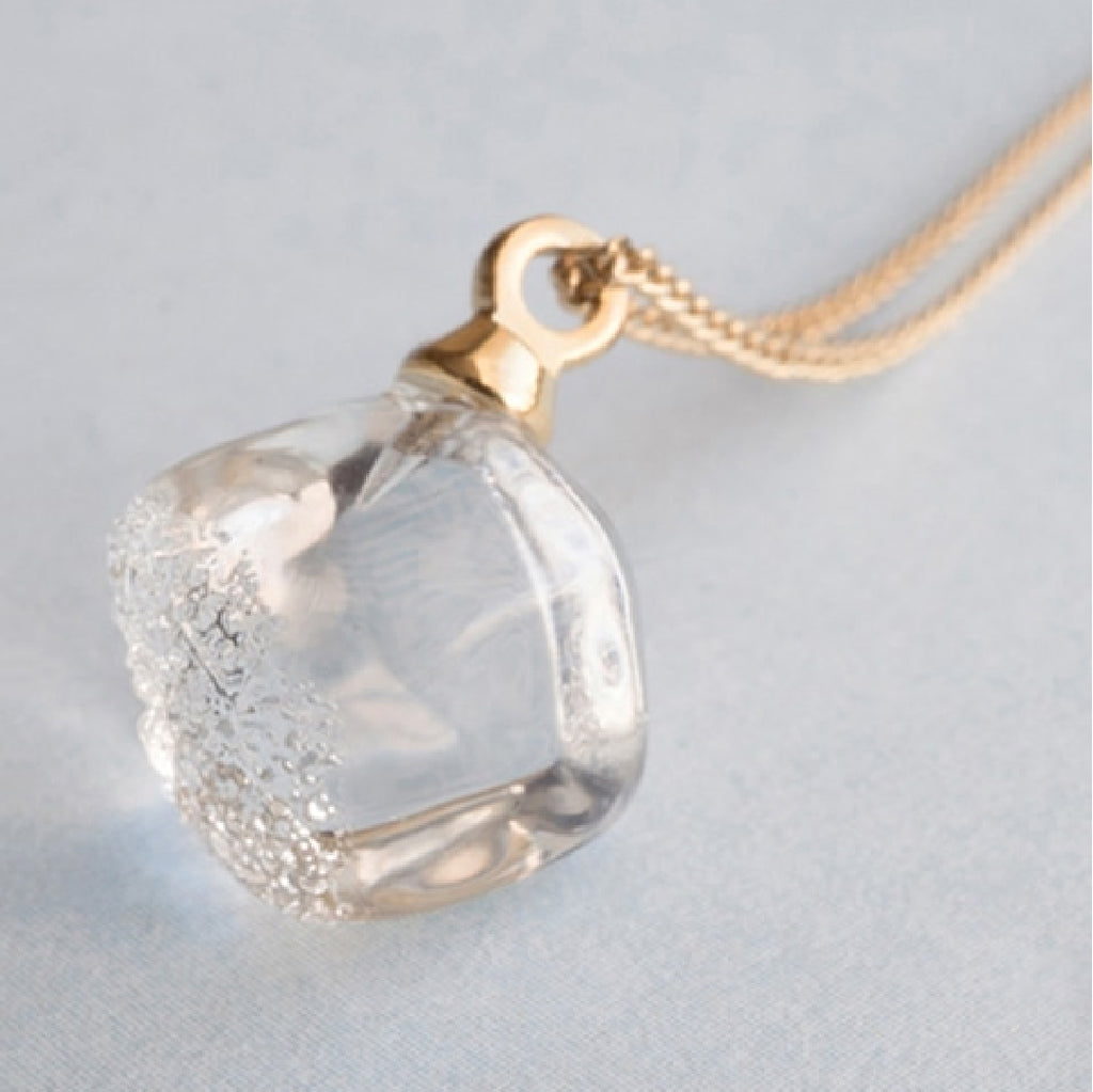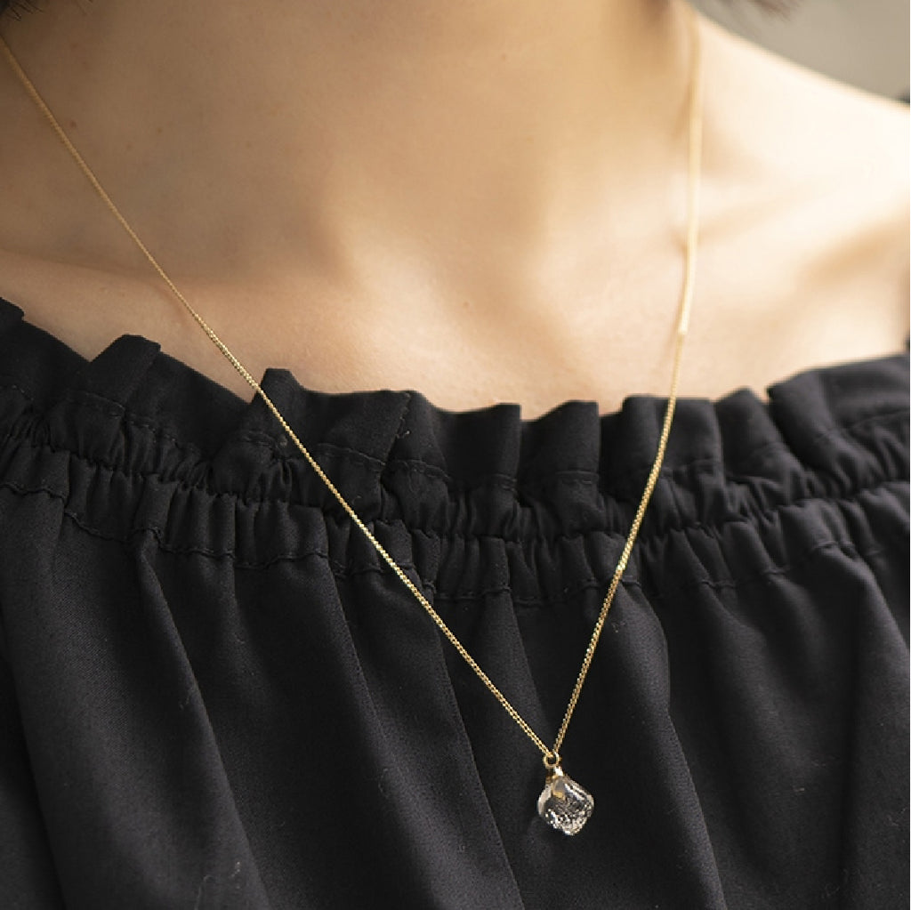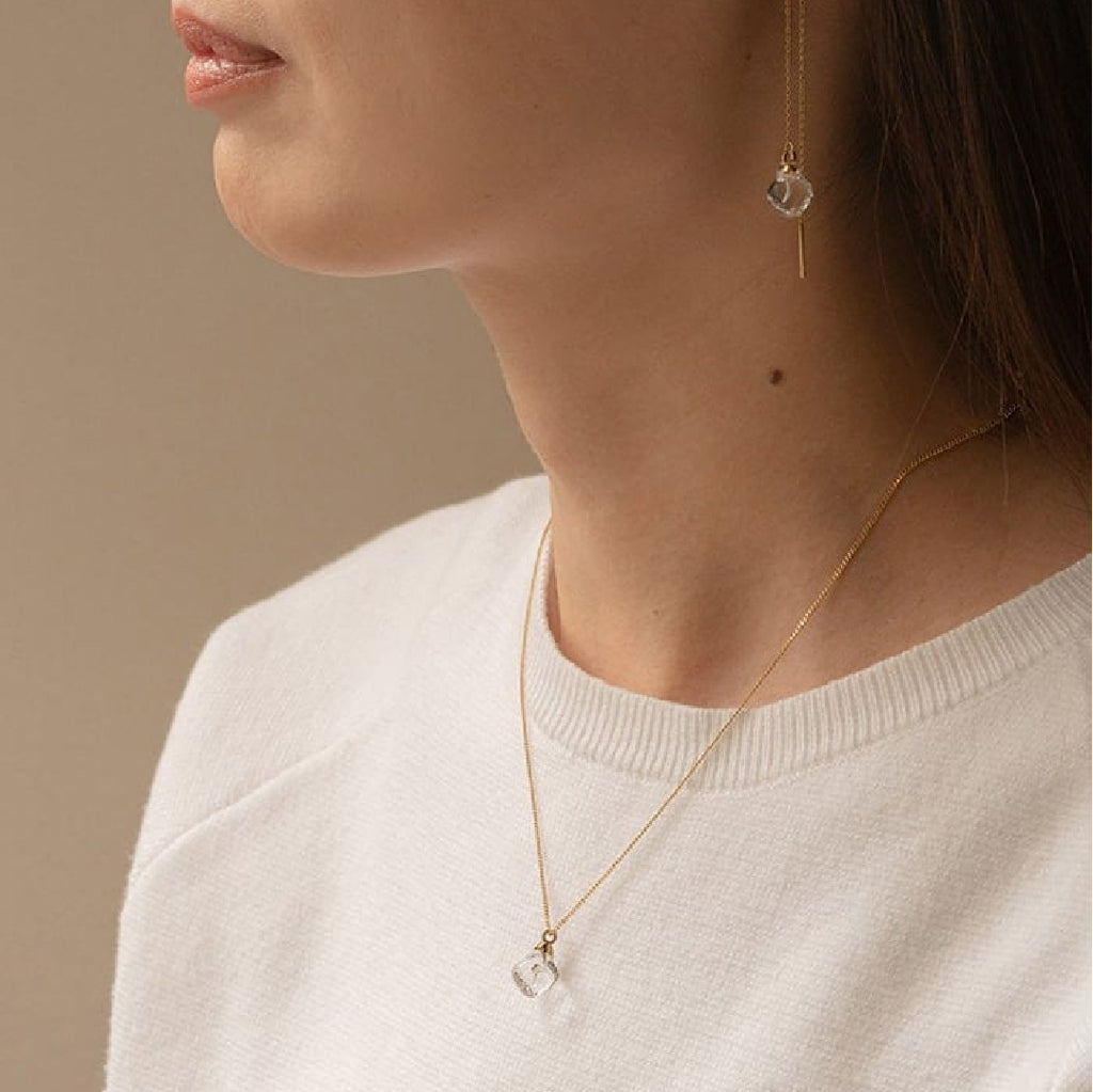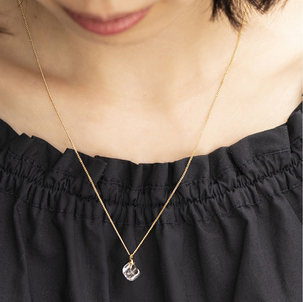 溶けだしたような小さなキューブが、胸元で輝きます。