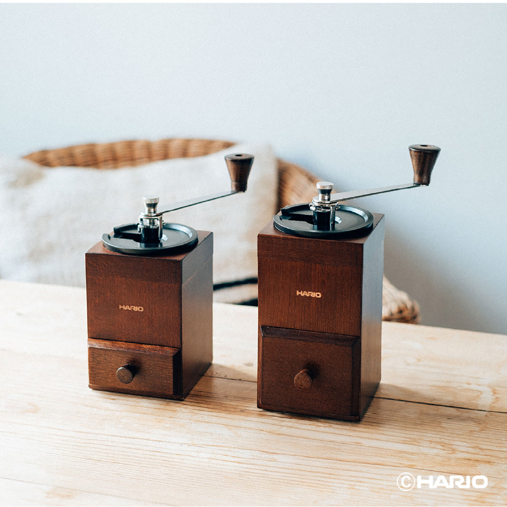 インテリア性を備えた木製キューブ型コーヒーミル。