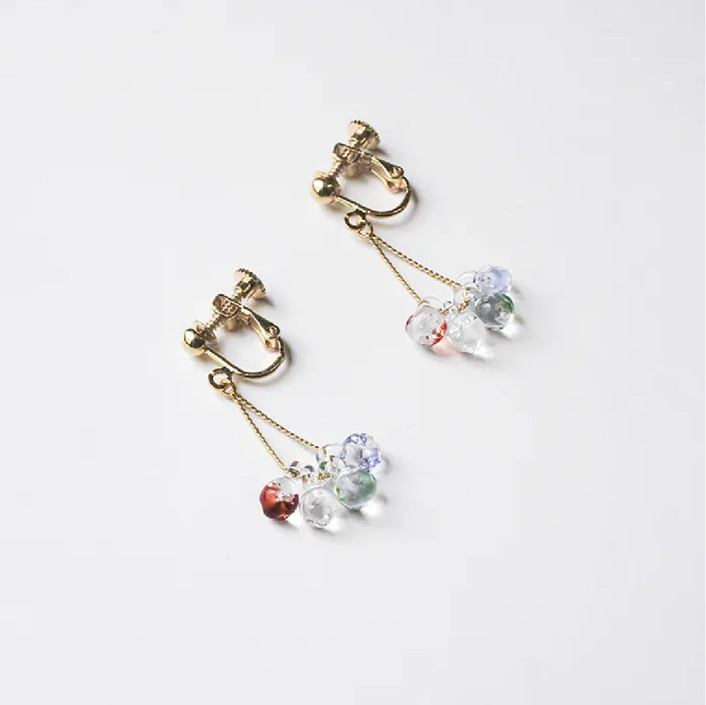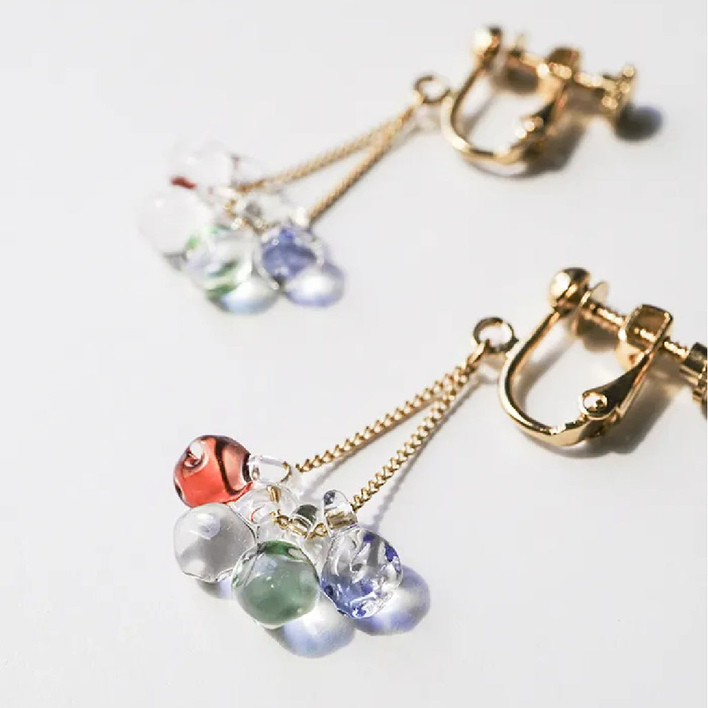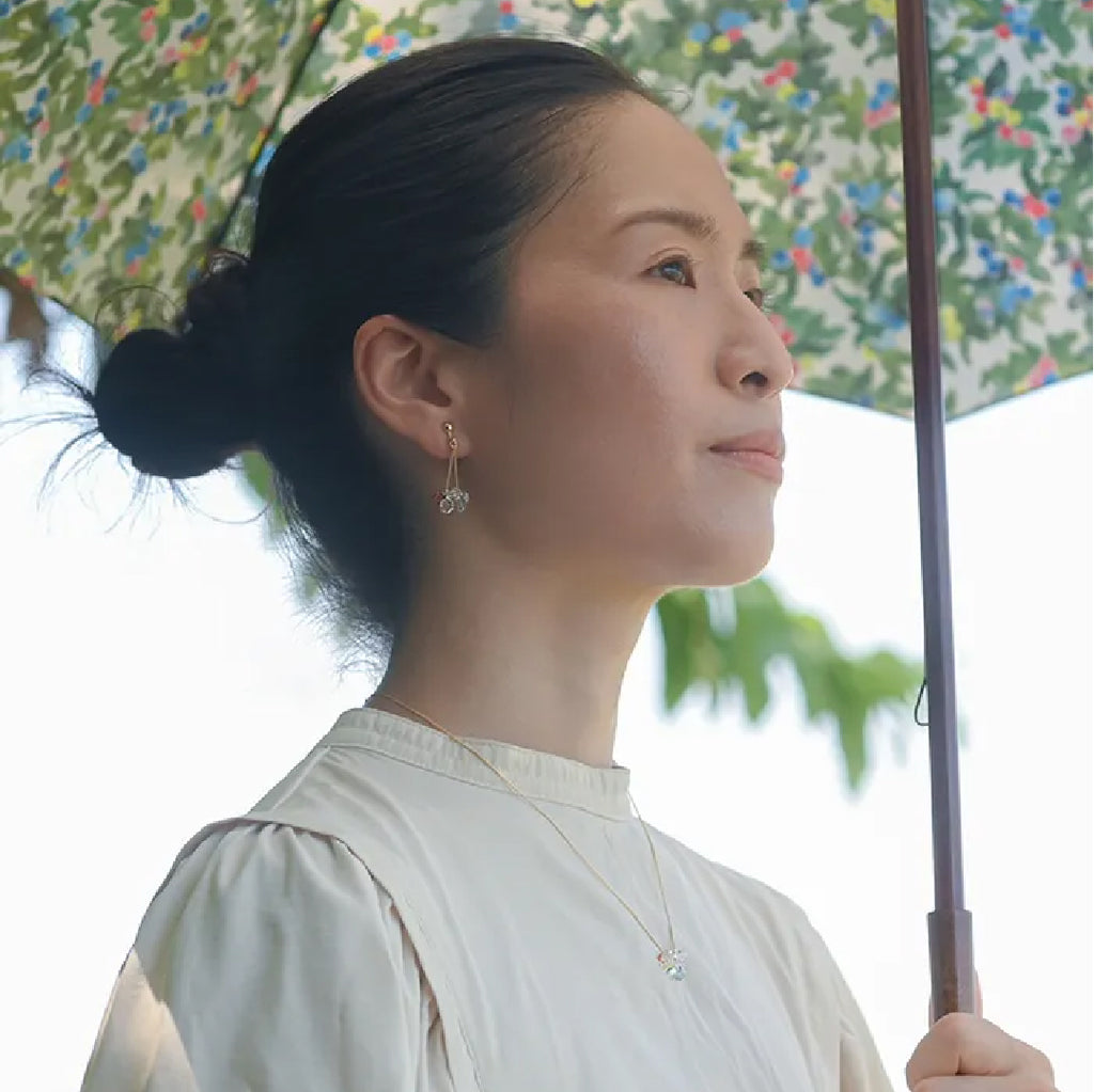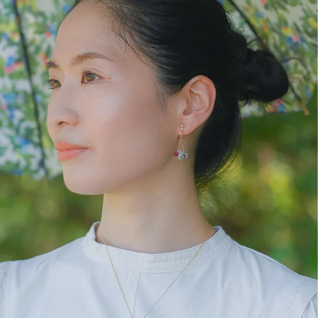 イイダ傘店の繊細で鮮やかなテキスタイルをガラスで表現した、生き生きと輝くガラスのアクセサリー。