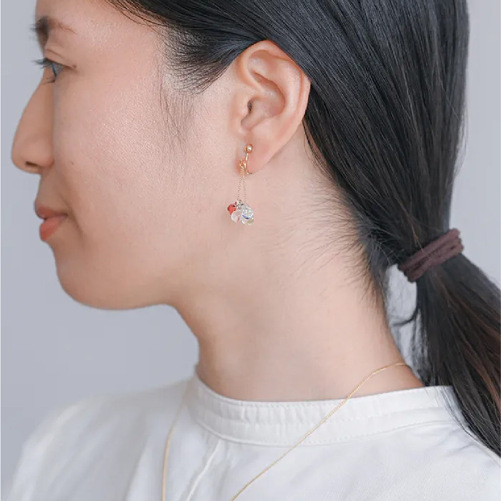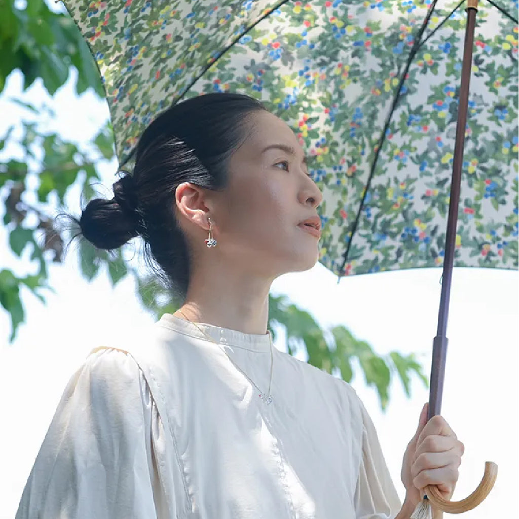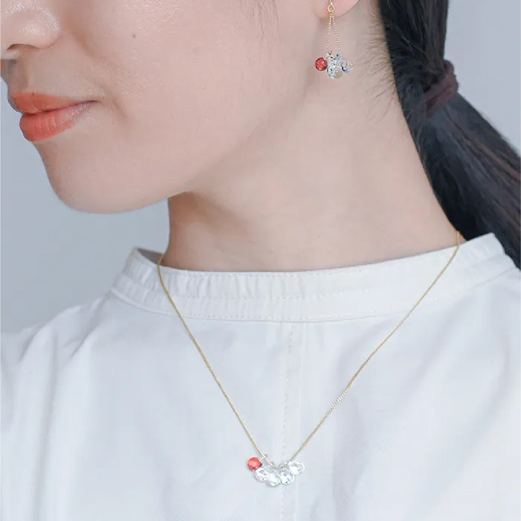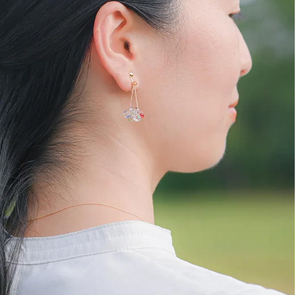 イイダ傘店の繊細で鮮やかなテキスタイルをガラスで表現した、生き生きと輝くガラスのアクセサリー。