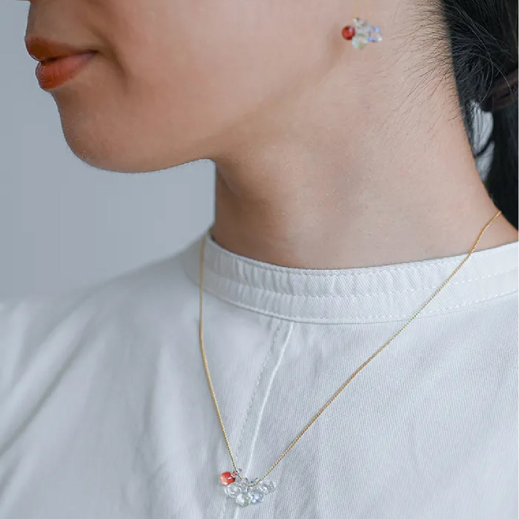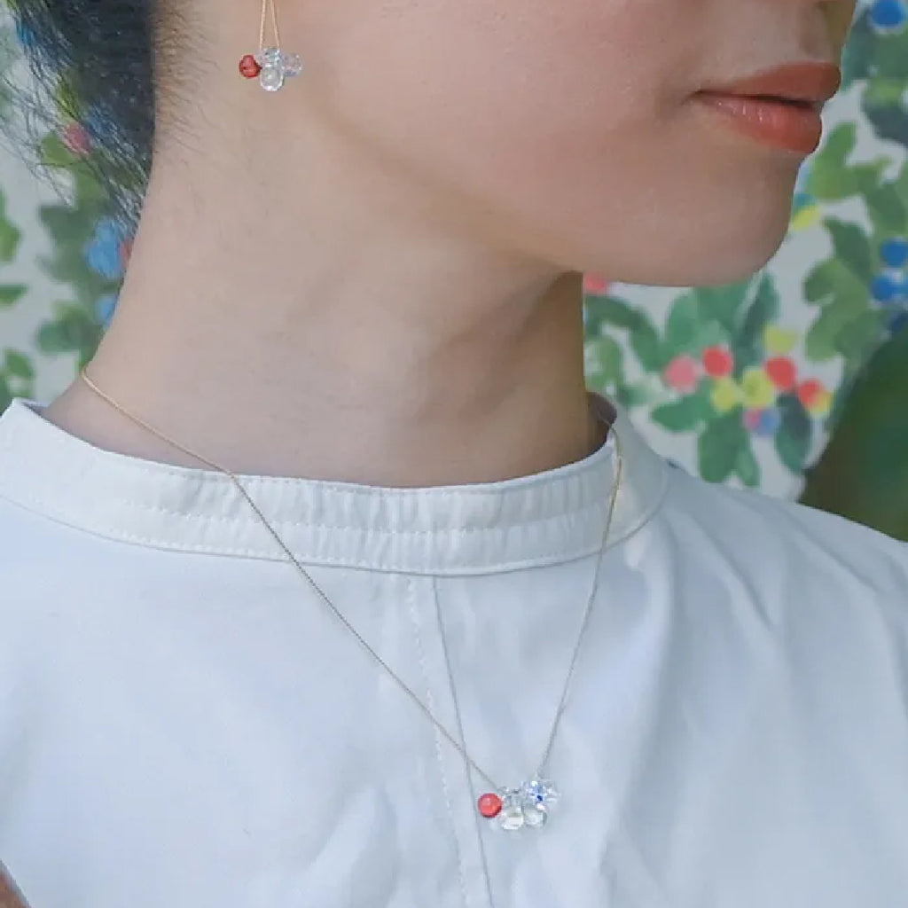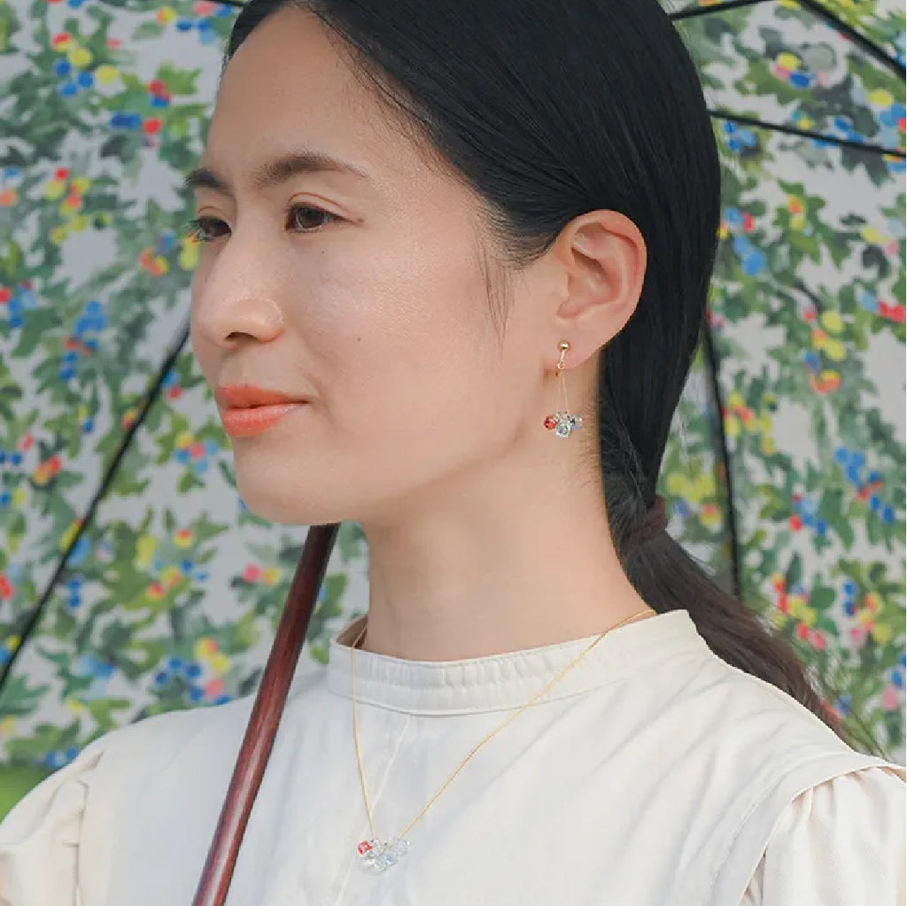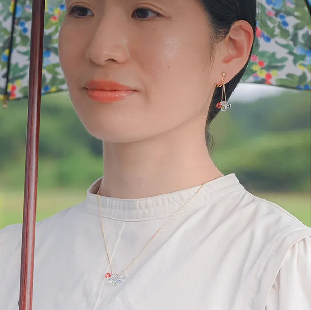 イイダ傘店の繊細で鮮やかなテキスタイルをガラスで表現した、生き生きと輝くガラスのアクセサリー。