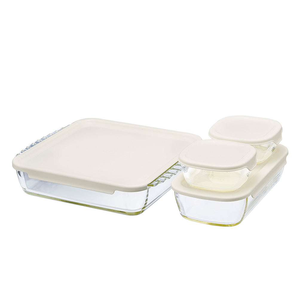 スタッキング可能で冷蔵庫収納しやすい角型の耐熱ガラスコンテナセット。