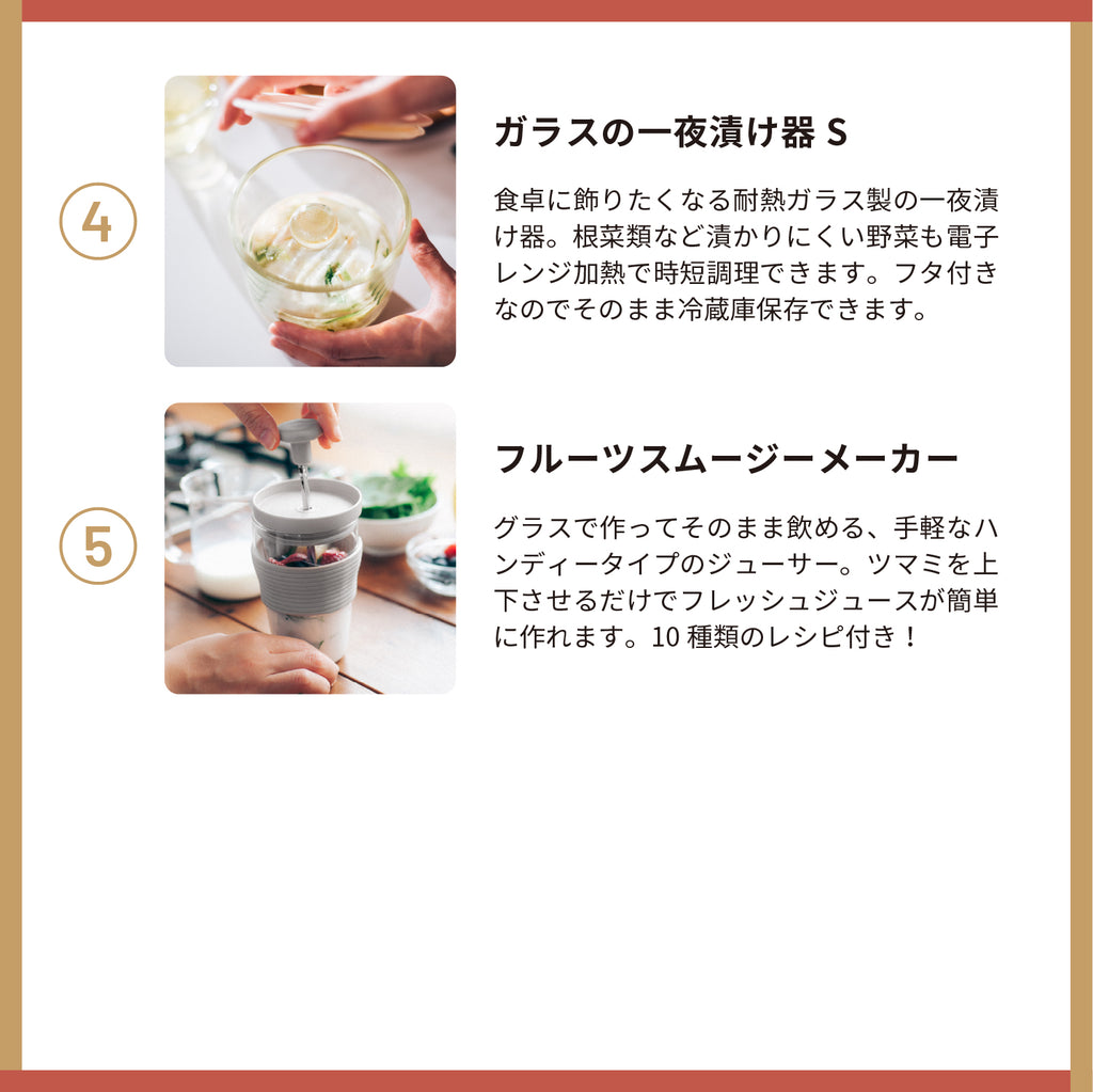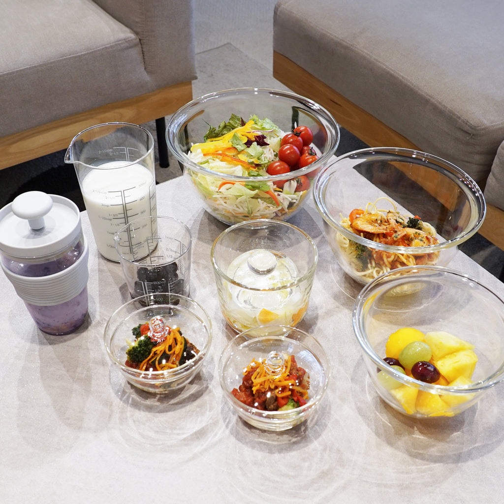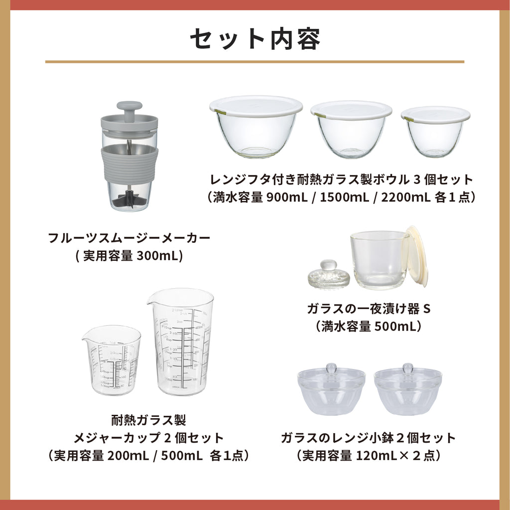 ネットショップ限定の「ガラスのレンジ小鉢」や、フタ付きの耐熱ガラスボウル、メジャーカップなど、毎日の下ごしらえから食卓まで快適に彩ってくれるアイテムを詰め合わせました。料理の時間がもっと楽しくなる、使い勝手抜群のキッチン福袋です。