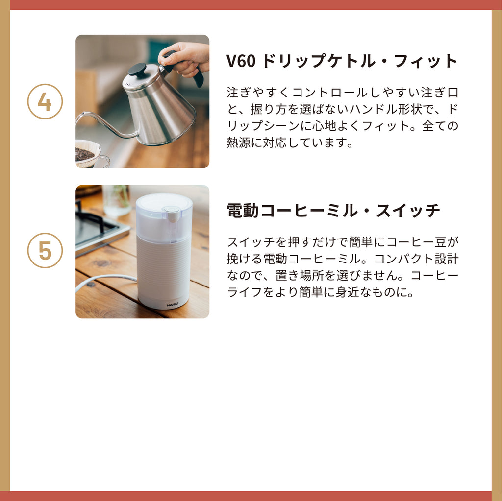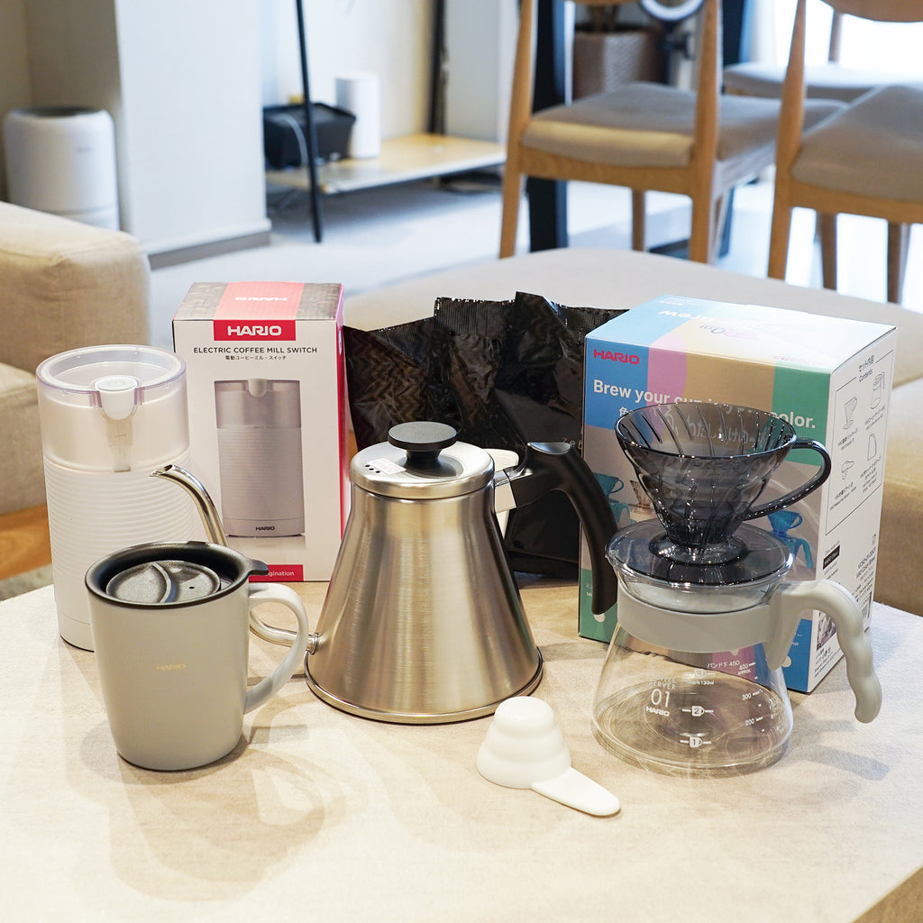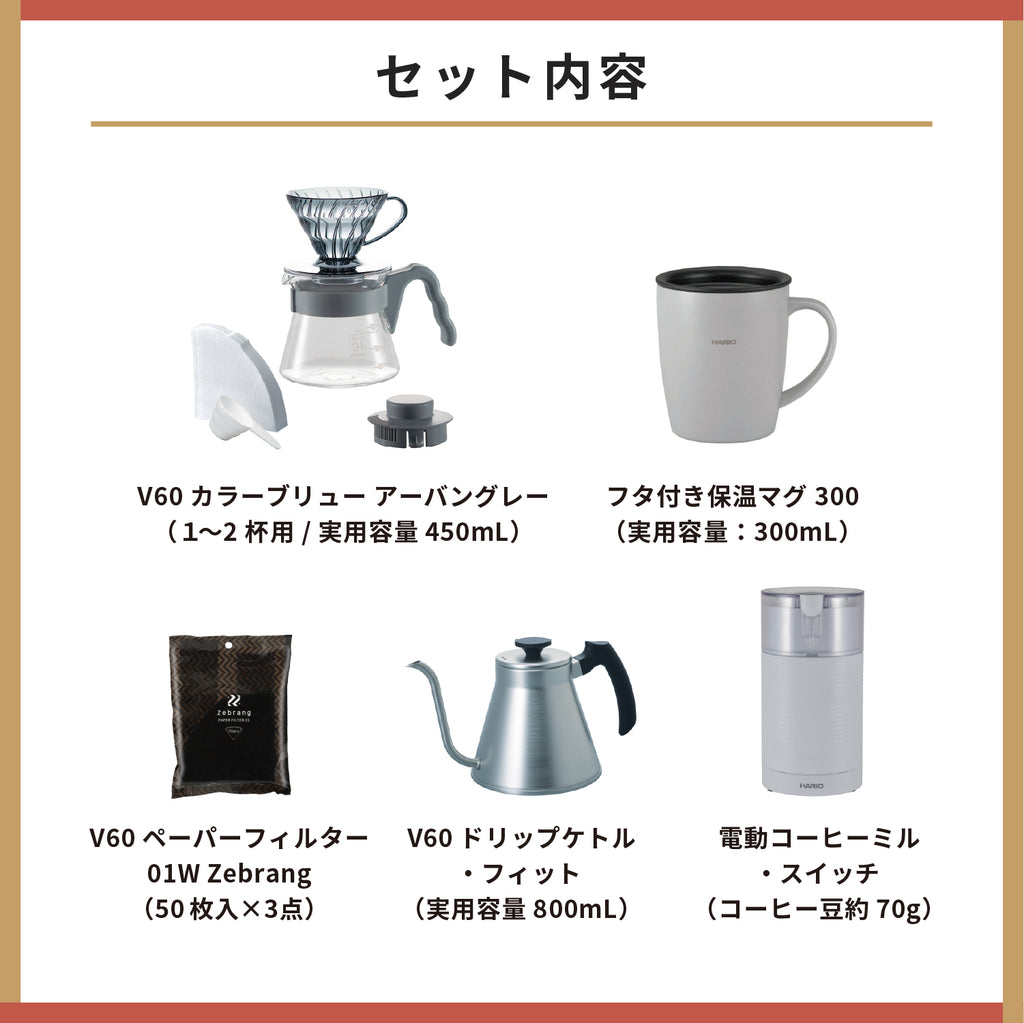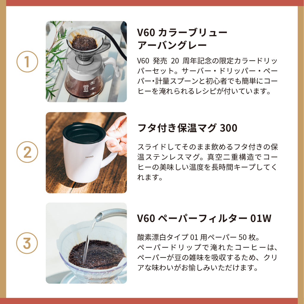 V60発売20周年を記念した限定カラーのハンドドリップセットをはじめ、ハンドドリップに必要なコーヒーアイテムをぎゅっと詰め込んだ、お得で特別なコーヒー器具の福袋です。開けた瞬間からコーヒータイムが楽しみになる、嬉しいセットです。