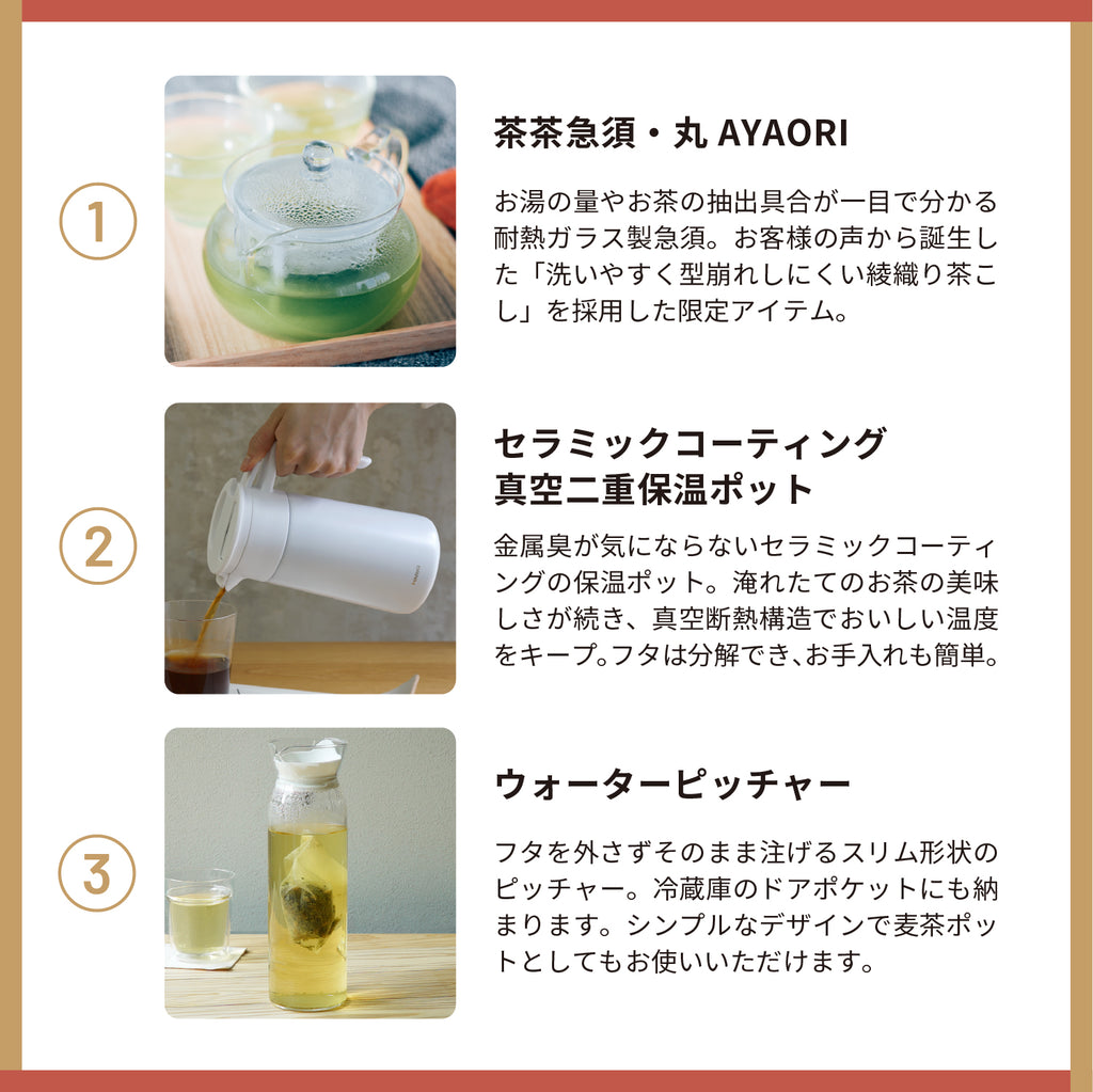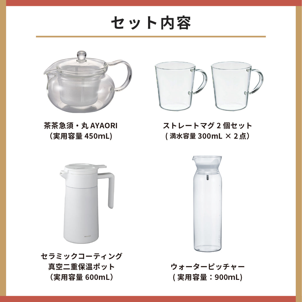 HARIO NETSHOPで人気の「茶茶急須・丸 AYAORI」をはじめ、保温ポットや耐熱ガラスのピッチャー、使いやすいマグをセットにした、お茶を楽しむための福袋。毎日のティータイムがもっと特別になるアイテムを揃えました。
