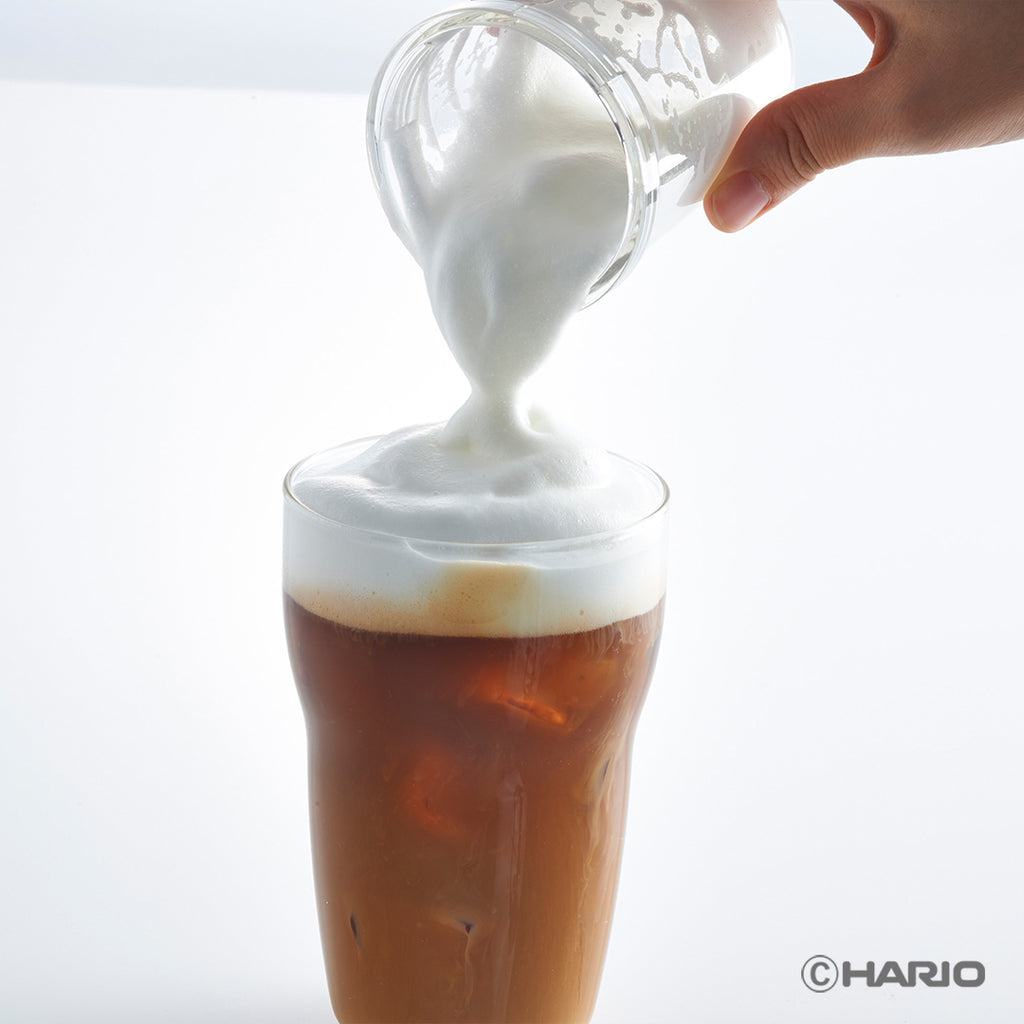 ハンドシェイクタイプのミルククリ―マーです。冷たい牛乳をカップの目盛り部分まで入れ、フィルターと上下カップをセットして20〜30秒ほどシェイクすると、カプチーノ・カフェラテ用のキメ細かくなめらかな泡立ちミルクができあがります。できあがった泡立ちミルクは耐熱容器に移し替えて、電子レンジで温めればホットドリンクでも楽しめます。