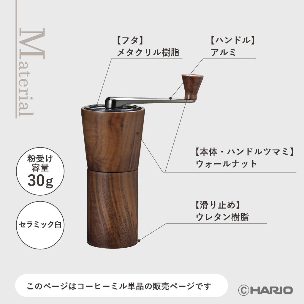 材質 木部:ウォールナット材 内側ホッパー:PP 臼:セラミック ハンドル:アルミ フタ:メタクリル シャフト:ステンレス 臼座・粗さ調節ツマミ・ワッシャー:ナイロン 底面滑り止め:ウレタン樹脂