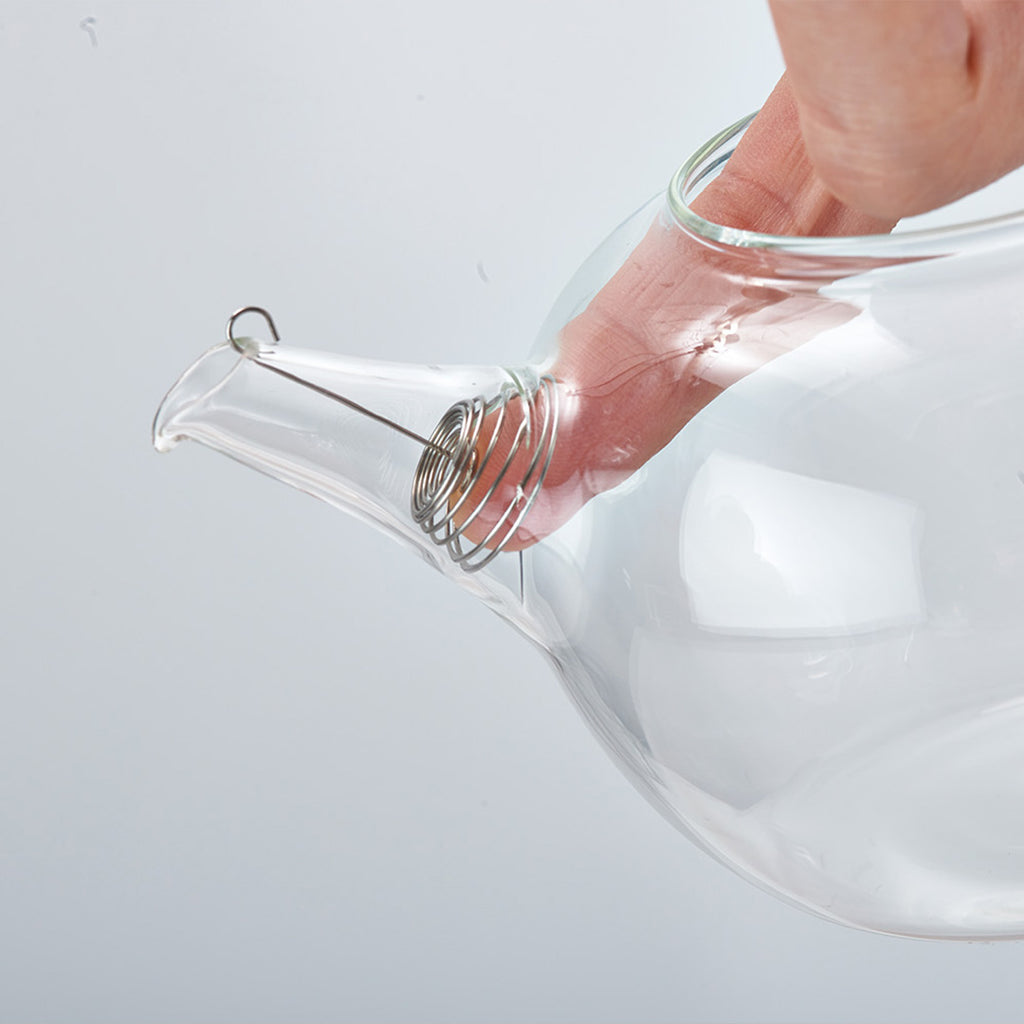 全て耐熱ガラス素材の手作りです。茶こしはフック部から注ぎ口に入れ、スプリング部を押して、フック部の先を注ぎ口にひっかけます。