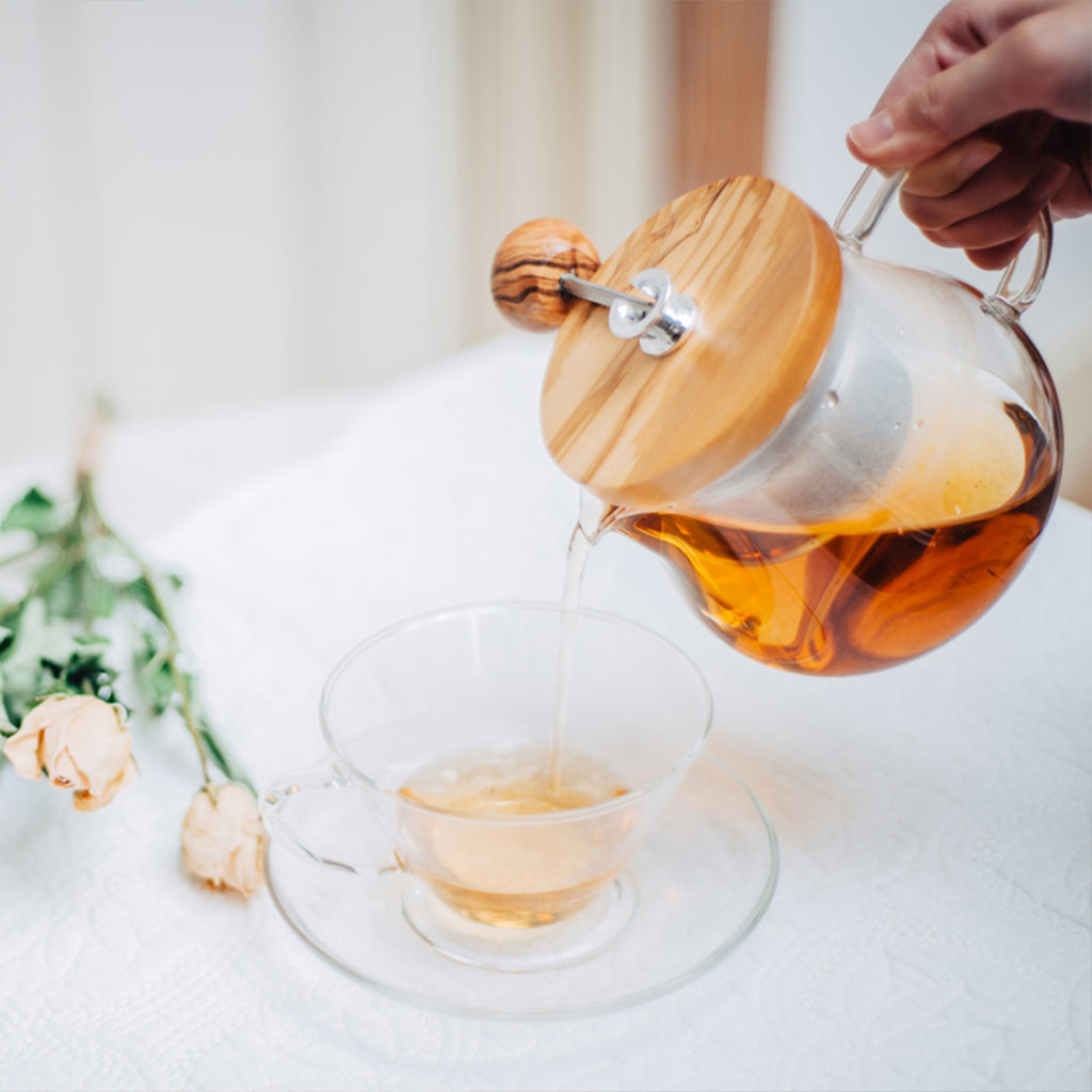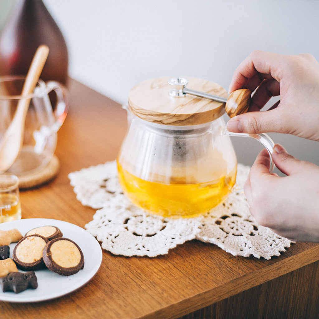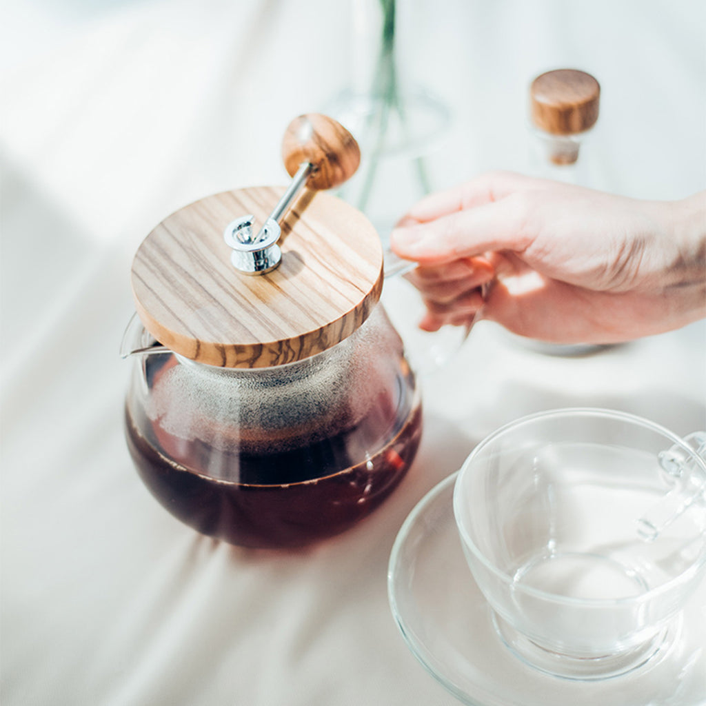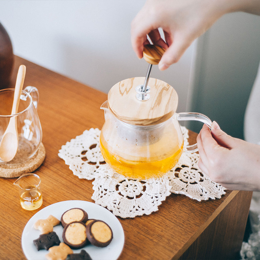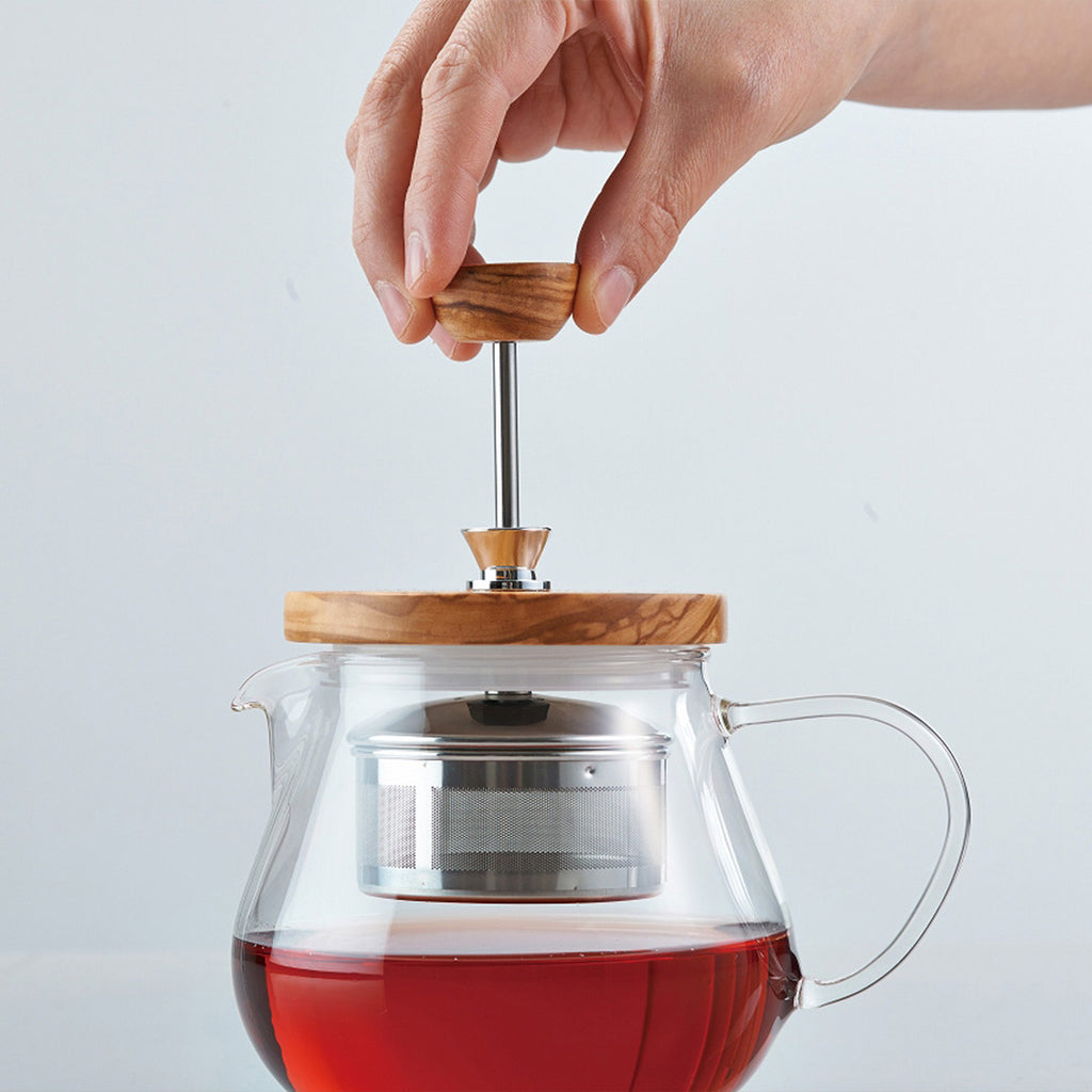 木部はオリーブウッドを使用したナチュラルテイスト。お茶をお好みの濃さに抽出したら、ティーバッグのようにストレーナーを引き上げられるので、2杯目も美味しくいただけます。